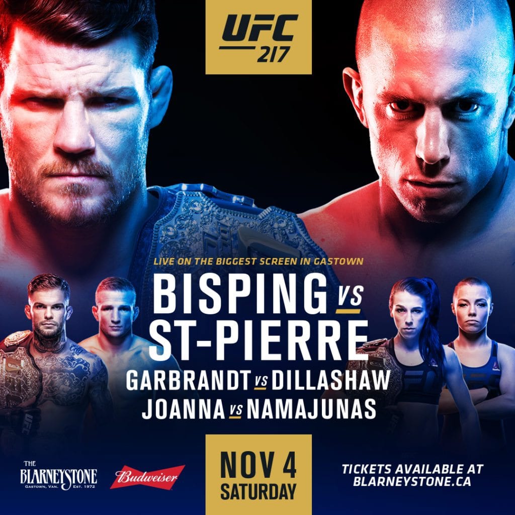 UFC 217 will be headlined by the middleweight title fight pitting Michael Bisping against the returning Georges St-Pierre. In the bantamweight championship co-main event, Cody Garbrandt looks to settle his grudge match with former teammate TJ Dillashaw.