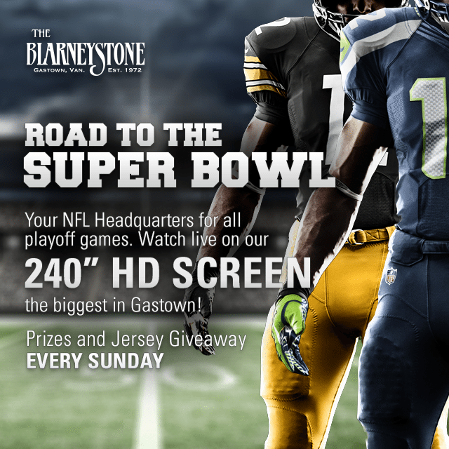 Join us every week for The Road To Super Bowl Party! Watch all NFL games on our 240″ screen, the BIGGEST in Gastown!